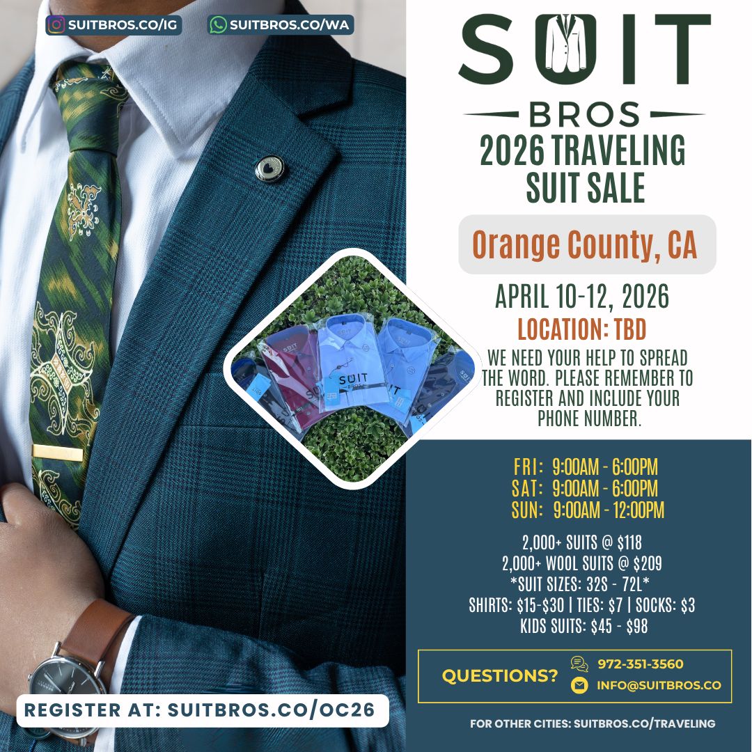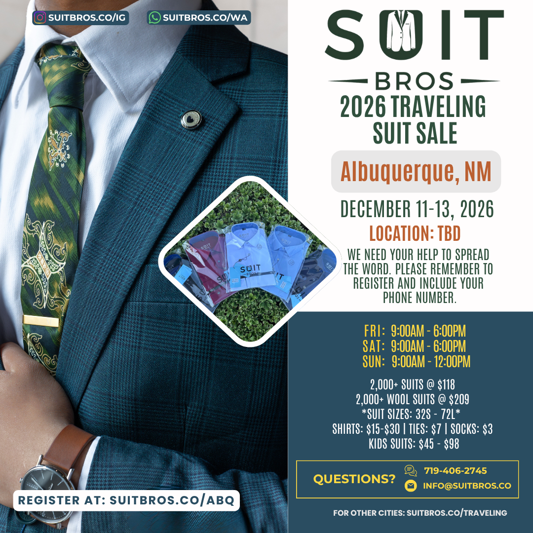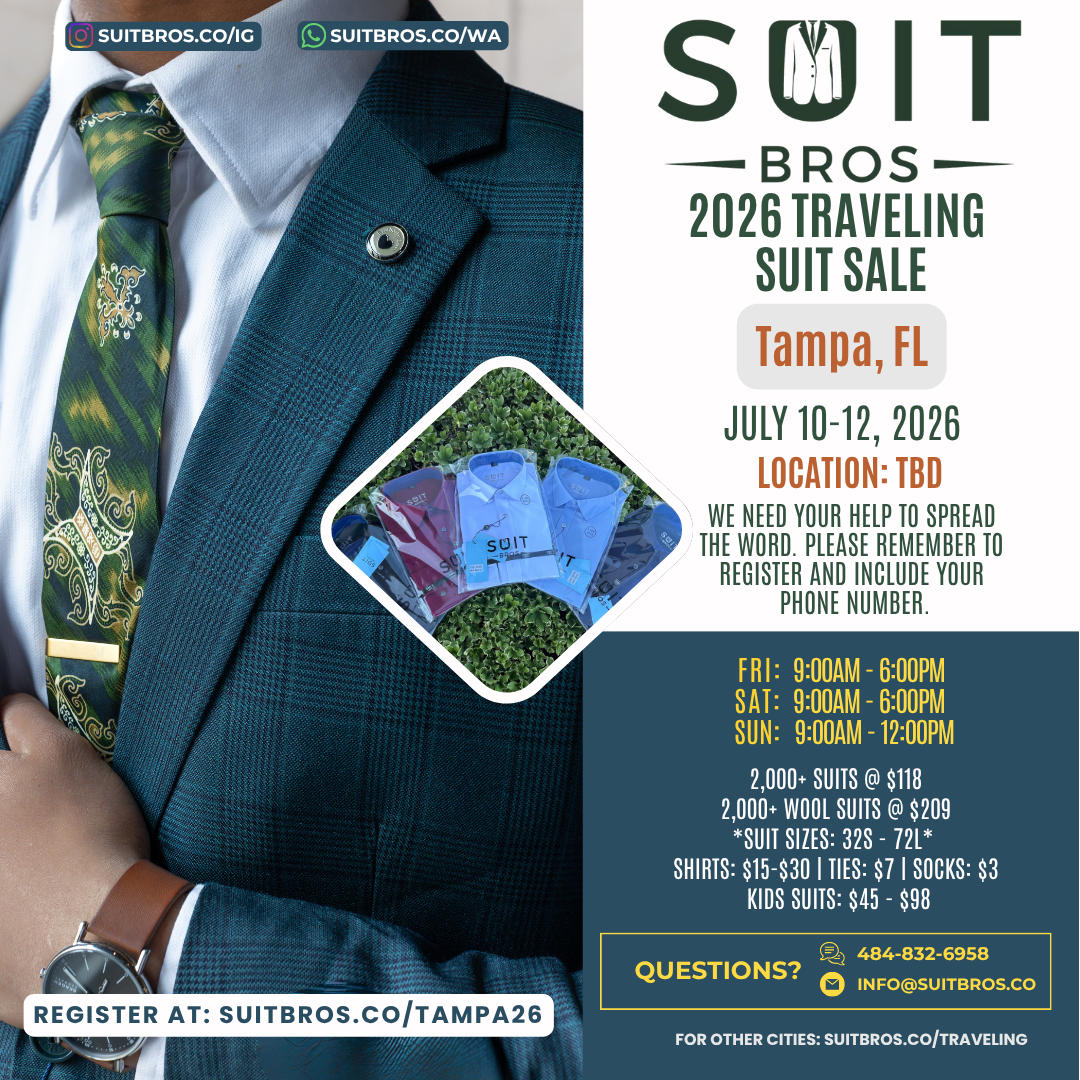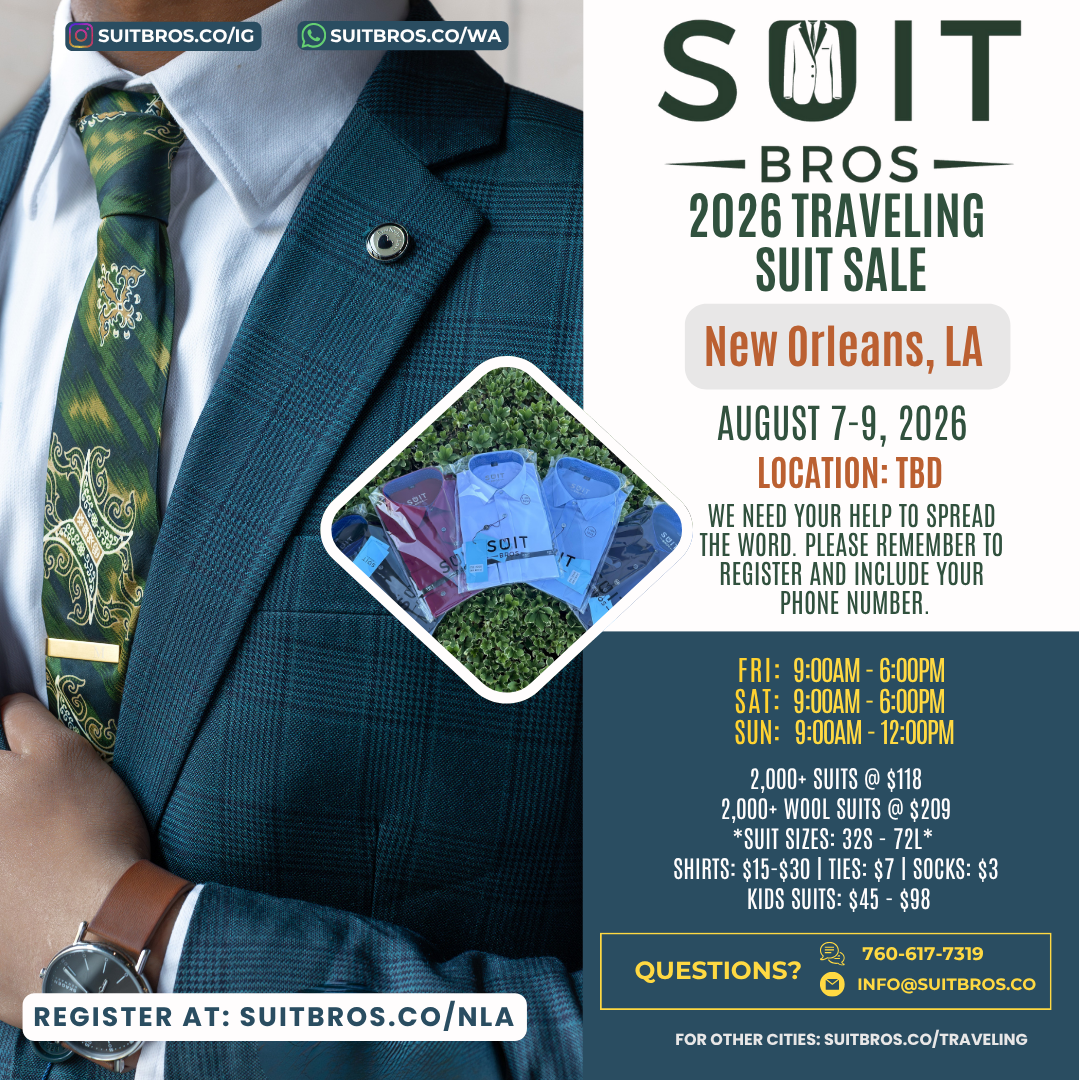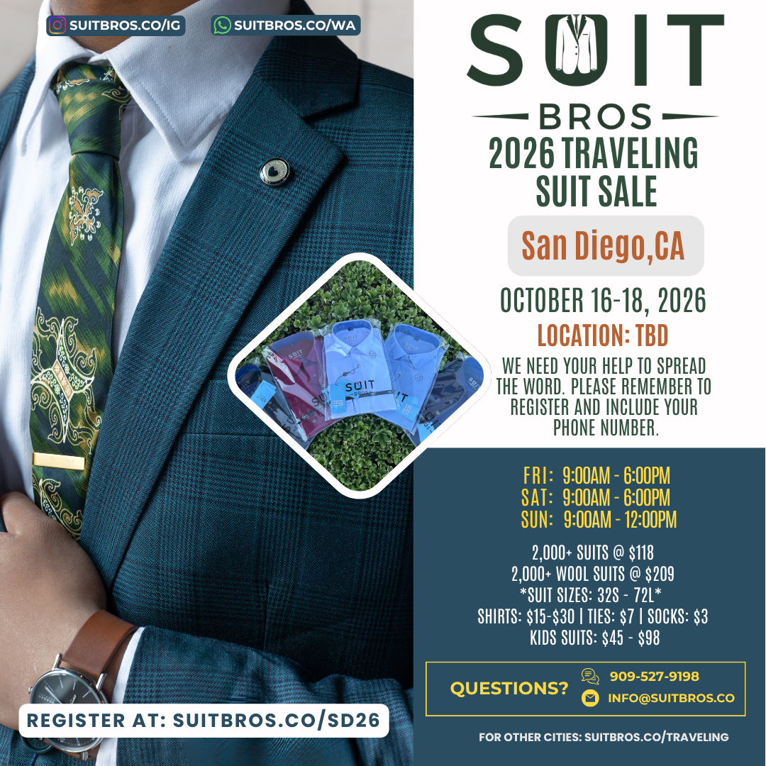 Traveling Suit Sale What is it?Simply put, we will bring thousands of suits, shirts, and ties to a city near you for one weekend.Please feel free to check out our posts on Instagram to see some of our past events.We need your help to spread the word so click on the city closest to you, RSVP, and share with your friends and family!We hope to see you at one of our events. Until then, we hope that you have a wonderful day filled with many “fine works”!With gratitude and appreciation,Suit Bros Upcoming Events Tulsa, OK | November 7-9, 2025 Sunnyvale, CA | November 14-16, 2025 Milwaukee, WI | December 5-7, 2025 St. George, UT | December 12-14, 2025 Las Vegas, NV | January 9-11, 2026 Phoenix, AZ | January 16-18, 2026 Seattle, WA | Feb 6-8, 2026 Portland, OR | Feb 20-22, 2026 Chicago, IL | March 6-8, 2026 Houston, TX | March 13-15, 2026 Orange County, CA | April 10-12, 2026 Newburgh, NY | April 23-26, 2026 Brooklyn, NY | May 1-3, 2026 Denver, CO | May 15-17, 2026 Sacramento, CA | June 4-7, 2026 Detroit, MI | June 19-21, 2026 Minneapolis, MN | June 26-28, 2026 Tampa, FL | July 10-12, 2026 Jacksonville, FL | July 17-19, 2026 New Orleans, LA | Aug 7-9, 2026 Kansas City, MO | Aug 14-16, 2026 Charleston, SC | Sept 4-6, 2026 Nashville, TN | Sept 11-13, 2026 San Diego, CA | Oct 16-18, 2026 New Jersey | Nov 6-8, 2026 Philadelphia, PA | Nov 13-15, 2026 Albuquerque, NM | Dec 11-13, 2026 Fresno, CA | Dec 18-20, 2026 Potential Events in 2027 Ft. Lauderdale, FL Los Angeles, CA Oklahoma City, OK San Antonio, TX Don’t see your city listed? Fill out the form below to request a visit Name(Required) First Last Email(Required) PhoneAddress(Required) City State AlabamaAlaskaAmerican SamoaArizonaArkansasCaliforniaColoradoConnecticutDelawareDistrict of ColumbiaFloridaGeorgiaGuamHawaiiIdahoIllinoisIndianaIowaKansasKentuckyLouisianaMaineMarylandMassachusettsMichiganMinnesotaMississippiMissouriMontanaNebraskaNevadaNew HampshireNew JerseyNew MexicoNew YorkNorth CarolinaNorth DakotaNorthern Mariana IslandsOhioOklahomaOregonPennsylvaniaPuerto RicoRhode IslandSouth CarolinaSouth DakotaTennesseeTexasUtahU.S. Virgin IslandsVermontVirginiaWashingtonWest VirginiaWisconsinWyomingArmed Forces AmericasArmed Forces EuropeArmed Forces Pacific ZIP Code How did you hear about us?(Required)InstagramFriendsAnother EventAre you able and willing to help us spread the word if we do a suit sale near you?(Required) Sure Not this time CommentsThis field is for validation purposes and should be left unchanged.