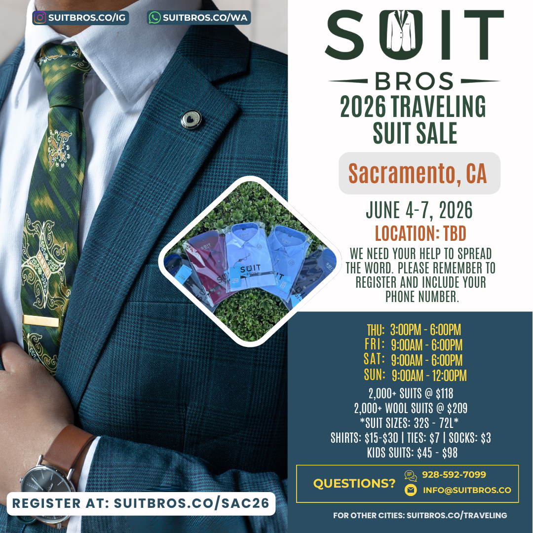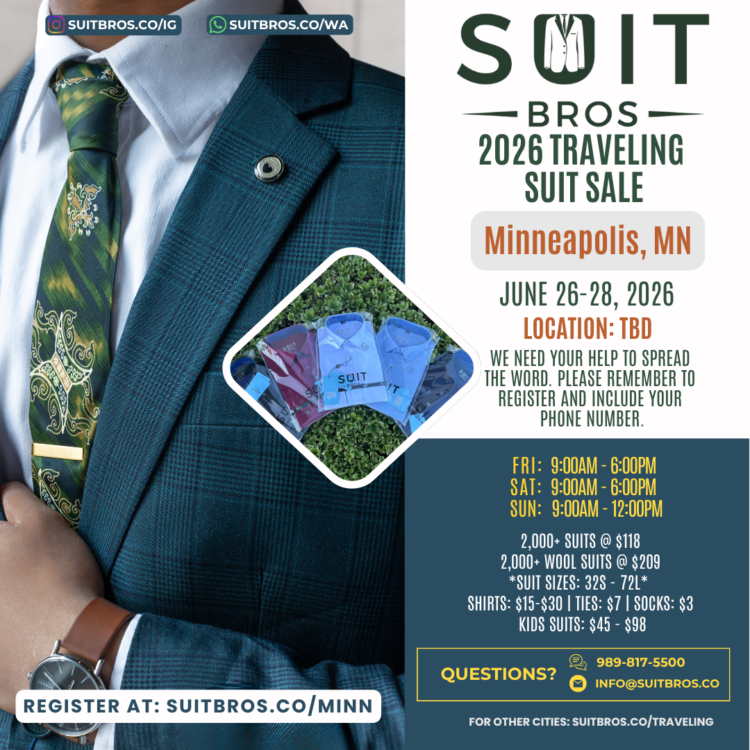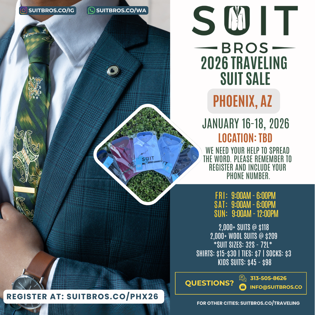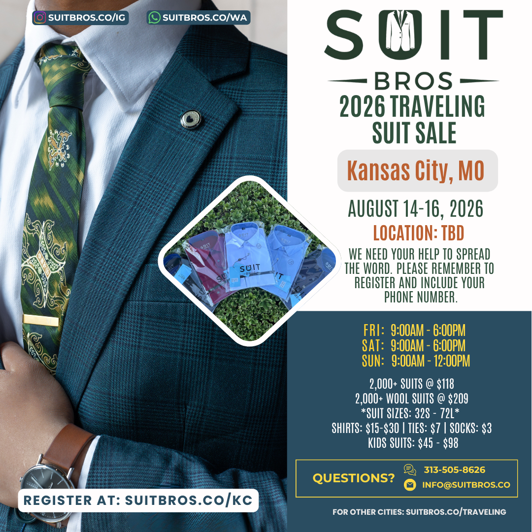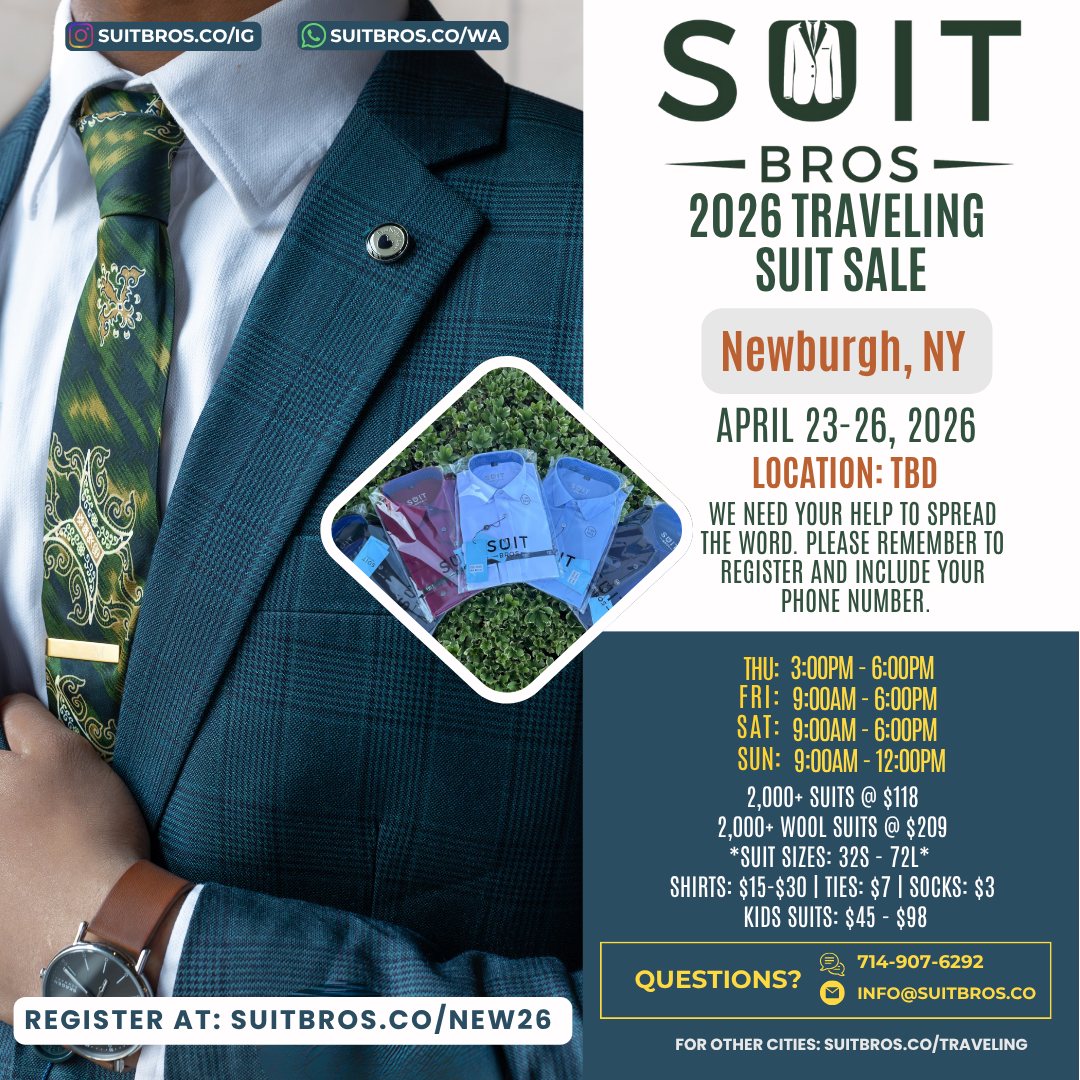 Traveling Suit Sale What is it?Simply put, we will bring thousands of suits, shirts, and ties to a city near you for one weekend.Please feel free to check out our posts on Instagram to see some of our past events.We need your help to spread the word so click on the city closest to you, RSVP, and share with your friends and family!We hope to see you at one of our events. Until then, we hope that you have a wonderful day filled with many “fine works”!With gratitude and appreciation,Suit Bros Upcoming Events Tulsa, OK | November 7-9, 2025 Sunnyvale, CA | November 14-16, 2025 Milwaukee, WI | December 5-7, 2025 St. George, UT | December 12-14, 2025 Las Vegas, NV | January 9-11, 2026 Phoenix, AZ | January 16-18, 2026 Seattle, WA | Feb 6-8, 2026 Portland, OR | Feb 20-22, 2026 Chicago, IL | March 6-8, 2026 Houston, TX | March 13-15, 2026 Orange County, CA | April 10-12, 2026 Newburgh, NY | April 23-26, 2026 Brooklyn, NY | May 1-3, 2026 Denver, CO | May 15-17, 2026 Sacramento, CA | June 4-7, 2026 Detroit, MI | June 19-21, 2026 Minneapolis, MN | June 26-28, 2026 Tampa, FL | July 10-12, 2026 Jacksonville, FL | July 17-19, 2026 New Orleans, LA | Aug 7-9, 2026 Kansas City, MO | Aug 14-16, 2026 Charleston, SC | Sept 4-6, 2026 Nashville, TN | Sept 11-13, 2026 San Diego, CA | Oct 16-18, 2026 New Jersey | Nov 6-8, 2026 Philadelphia, PA | Nov 13-15, 2026 Albuquerque, NM | Dec 11-13, 2026 Fresno, CA | Dec 18-20, 2026 Potential Events in 2027 Ft. Lauderdale, FL Los Angeles, CA Oklahoma City, OK San Antonio, TX Don’t see your city listed? Fill out the form below to request a visit Name(Required) First Last Email(Required) PhoneAddress(Required) City State AlabamaAlaskaAmerican SamoaArizonaArkansasCaliforniaColoradoConnecticutDelawareDistrict of ColumbiaFloridaGeorgiaGuamHawaiiIdahoIllinoisIndianaIowaKansasKentuckyLouisianaMaineMarylandMassachusettsMichiganMinnesotaMississippiMissouriMontanaNebraskaNevadaNew HampshireNew JerseyNew MexicoNew YorkNorth CarolinaNorth DakotaNorthern Mariana IslandsOhioOklahomaOregonPennsylvaniaPuerto RicoRhode IslandSouth CarolinaSouth DakotaTennesseeTexasUtahU.S. Virgin IslandsVermontVirginiaWashingtonWest VirginiaWisconsinWyomingArmed Forces AmericasArmed Forces EuropeArmed Forces Pacific ZIP Code How did you hear about us?(Required)InstagramFriendsAnother EventAre you able and willing to help us spread the word if we do a suit sale near you?(Required) Sure Not this time CommentsThis field is for validation purposes and should be left unchanged.